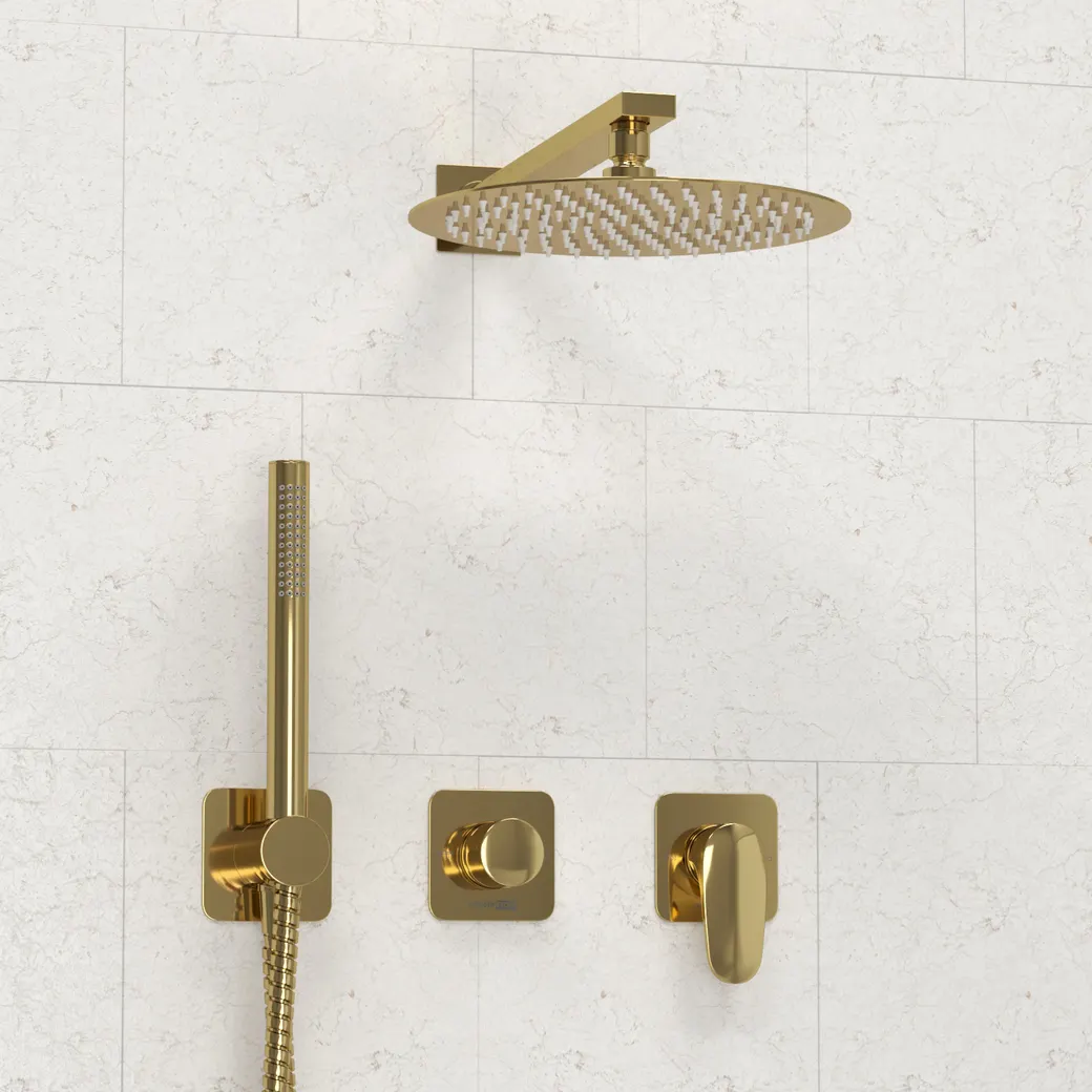- Эстетика и стиль: Золотой цвет встраиваемого комплекта для душа гармонично впишется в любой интерьер ванной комнаты.