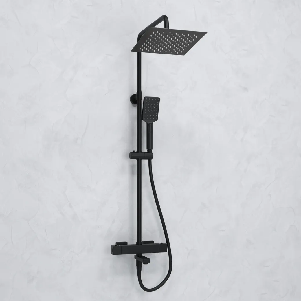 - Современный дизайн: Черный цвет и квадратная форма душевого комплекта добавляют элегантности и современности в интерьер ванной комнаты.