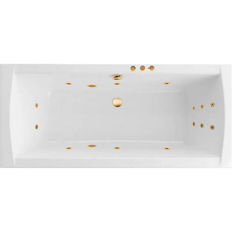 Акриловая ванна Excellent Aquaria Lux 180x80 WAEX.AQU18.SMART.GL с гидромассажем.Характеристики: Материал: литой акрил. Форма: прямоугольная. Ориентация: универсальная. Размеры (ШхВхД): 795х490х1795 мм. Глубина: 490 мм. Объем: 275 л. Расположение слива: по центру. Монтаж: пристенный, встраиваемый. Зоны гидромассажа: спины, ног, боковая. Цвет форсунок: золото. Управления: пневматическое. Зонный переключатель. В комплекте поставки: Ванна на каркасе, со сливом-переливом. Гидромассажная система (6 форсунок MIDI-JET). Массаж спины (6 форсунок MICRO-JET). Массаж ступней (2 форсунки MICRO-JET). Пневматическое управление (пневмокнопка вкл/выкл, регулятор подачи воздуха в систему). Кран-баланс (регулировка системы массажа спины). Защита от сухого пуска.