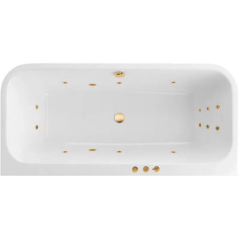 Акриловая ванна Excellent Arana 180x85 WAEX.ARA18.SMART.GL с гидромассажем.Характеристики: Материал: литой акрил. Форма: прямоугольная. Ориентация: универсальная. Размеры (ШхВхД): 845х475х1790 мм. Глубина: 475 мм. Объем: 260 л. Расположение слива: по центру. Монтаж: пристенный. Зоны гидромассажа: спины, ног, боковая. Цвет форсунок: золото. Управления: пневматическое. Зонный переключатель. В комплекте поставки: Ванна на каркасе, со сливом-переливом. Гидромассажная система (6 форсунок MIDI-JET). Массаж спины (6 форсунок MICRO-JET). Массаж ступней (2 форсунки MICRO-JET). Пневматическое управление (пневмокнопка вкл/выкл, регулятор подачи воздуха в систему). Кран-баланс (регулировка системы массажа спины). Защита от сухого пуска.