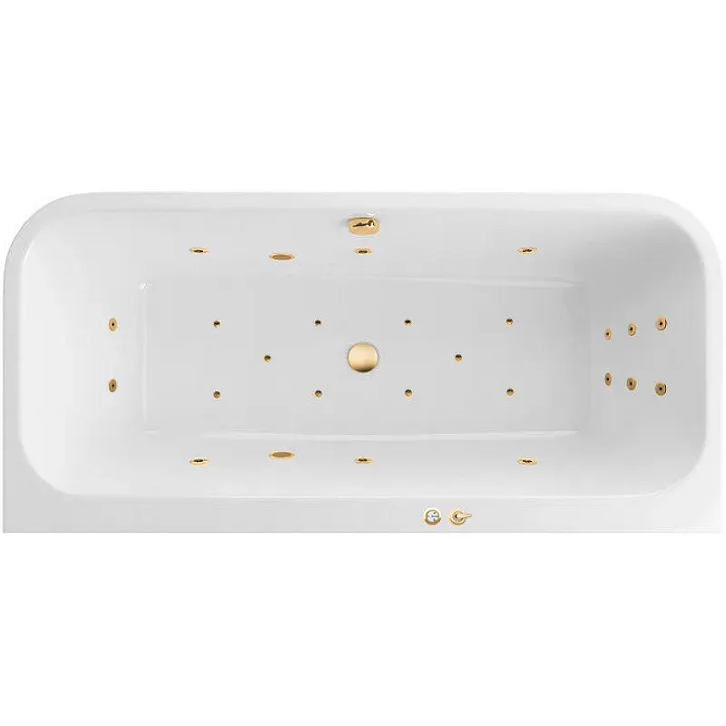 Акриловая ванна Excellent Arana 180x85 WAEX.ARA18.ULTRA.GL с гидромассажем.Характеристики: Материал: литой акрил. Форма: прямоугольная. Ориентация: универсальная. Размеры (ШхВхД): 845х475х1790 мм. Глубина: 475 мм. Объем: 260 л. Расположение слива: по центру. Монтаж: пристенный. С аэромассажем. Хромотерапия. Зоны гидромассажа: спины, ног, боковая. Цвет форсунок: золото. Управления: электронное. Зонный переключатель. В комплекте поставки: Ванна на каркасе, со сливом-переливом. Гидромассажная система (6 форсунок MIDI-JET) с функцией Пульсирующий режим. Аэромассажная система (10 форсунок AERO-JET) с функцией регулировки интенсивности массажа. Массаж спины (6 форсунок MICRO-JET). Массаж ступней (2 форсунки MICRO-JET). Кран-баланс (регулировка системы массажа спины). Электронное управление на 3 функции с датчиком уровня воды (защита от сухого пуска). Хромотерапия с функцией Стоп (7 режимов работы).