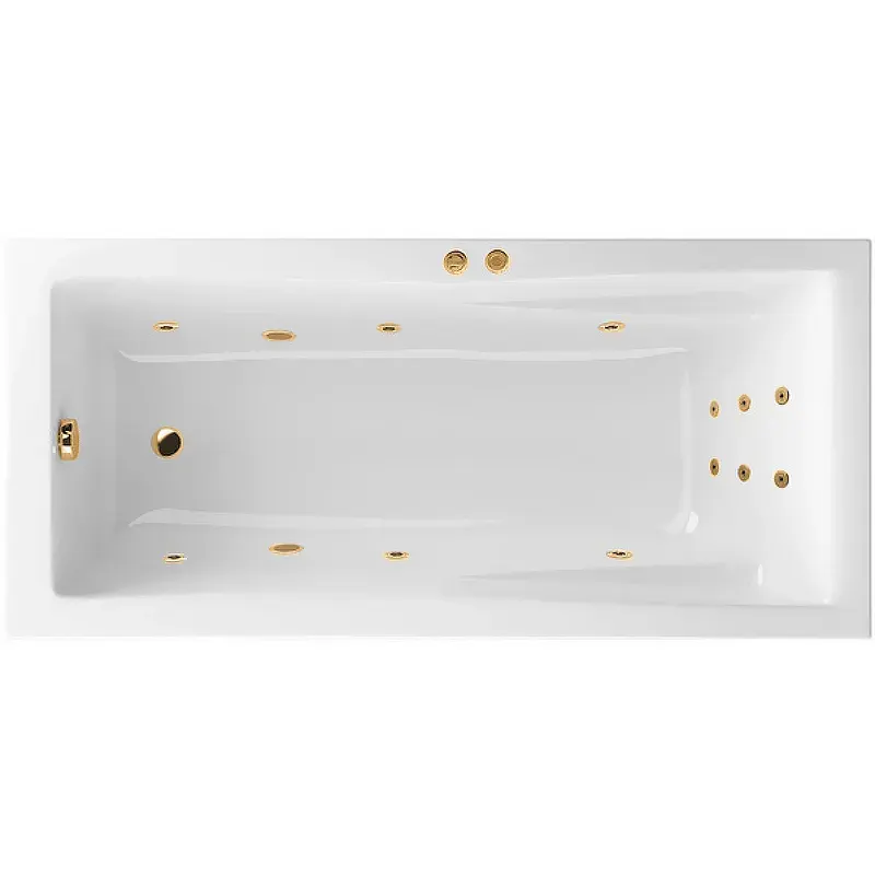 Акриловая ванна Excellent Palace 170x75 WAEX.PAL17.LINE.GL с гидромассажем.Характеристики: Материал: литой акрил. Форма: прямоугольная. Ориентация: универсальная. Размеры (ШхВхД): 750х465х1695 мм. Глубина: 465 мм. Объем: 240 л. Расположение слива: в ногах. Монтаж: пристенный, встраиваемый. Зоны гидромассажа: спины, боковая. Цвет форсунок: золото. Управление: пневматическое. В комплекте поставки: Ванна на каркасе, со сливом-переливом. Гидромассажная система (6 форсунок MIDI-JET). Массаж спины (6 форсунок MICRO-JET). Пневматическое управление (пневмокнопка вкл/выкл, регулятор подачи воздуха в систему).