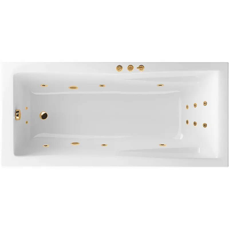 Акриловая ванна Excellent Palace 170x75 WAEX.PAL17.SMART.GL с гидромассажем.Характеристики: Материал: литой акрил. Форма: прямоугольная. Ориентация: универсальная. Размеры (ШхВхД): 750х465х1695 мм. Глубина: 465 мм. Объем: 240 л. Расположение слива: в ногах. Монтаж: пристенный, встраиваемый. Зоны гидромассажа: спины, ног, боковая. Цвет форсунок: золото. Управление: пневматическое. Зонный переключатель. В комплекте поставки: Ванна на каркасе, со сливом-переливом. Гидромассажная система (6 форсунок MIDI-JET). Массаж спины (6 форсунок MICRO-JET). Массаж ступней (2 форсунки MICRO-JET). Пневматическое управление (пневмокнопка вкл/выкл, регулятор подачи воздуха в систему). Кран-баланс (регулировка системы массажа спины). Защита от сухого пуска.