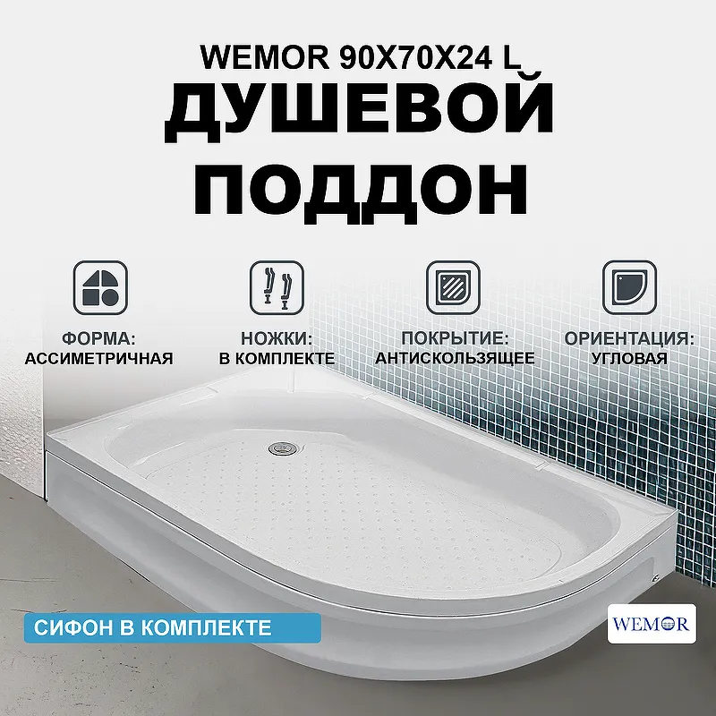 Акриловый поддон для душа Wemor 90x70x24 L 10000002091 левосторонний.Акриловый поддон для душа Wemor L 10000002091 в белом цвете устанавливается на левую сторону. Изделие шириной - 90 см, длиной - 24 см, высотой - 70 см, глубиной - 12 см. Общий вес поддона составляет 10,3 килограммов. Его форма является асимметричной, необычный вариант для ванной комнаты или санузла.На поверхности поддона предусмотрено антискользящее покрытие, вы можете не беспокоиться за свою безопасность во время водных процедур. Предмет выполнен из акрила, он устойчив к загрязнениям и воздействиям химических веществ. Максимальная нагрузка на дно составляет 300 кг. С поддоном вы сможете создать полноценную душевую зону. В комплектации идут набор ножек, каркас и сифон. Перед установкой и использованием нужно прочитать инструкцию в паспорте изделия. Раз в неделю проверяйте степень затяжек гаек на каркасе. Производство: Россия.Гарантийный срок: 1 год.Товар доступен к заказу, он прочно упакован. Срок доставки зависит от места, в котором вы живете. Характеристики: Материал: акрил. Размер (ШxВxД): 900x700x240 мм. Глубина: 12 см. Экран съемный. В комплекте поставки: Акриловый поддон для душа на ножках, с каркасом, с сифоном.