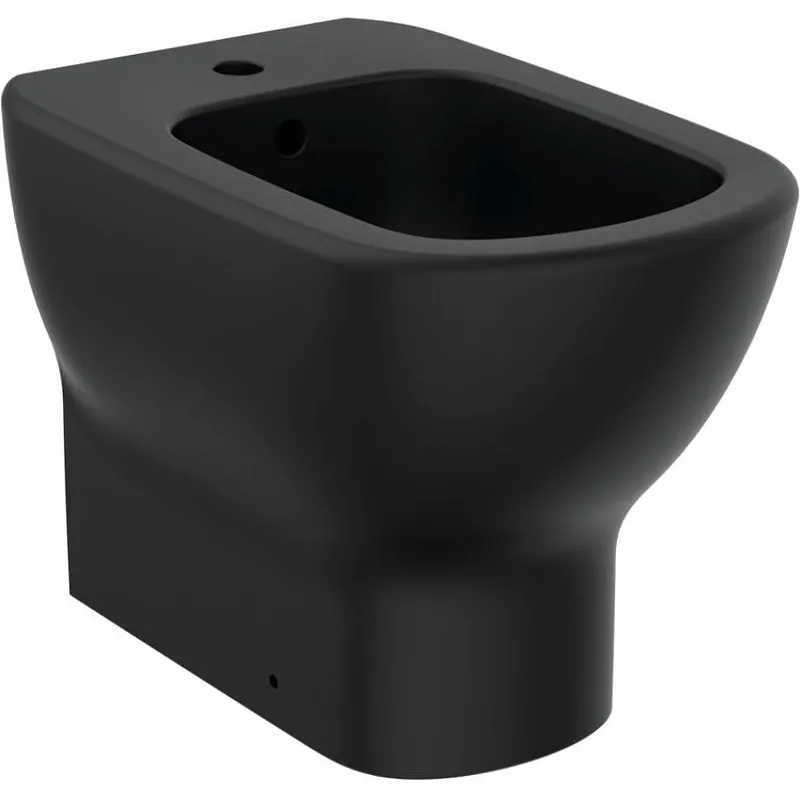 Биде Ideal Standard Tesi T3540V3 напольное .Характеристики: Цвет: черный матовый. Материал: фарфор. Размеры (ШхВхД): 36x40x55 см. Форма: прямоугольная. Выпуск: горизонтальный (в стену). Отверстие под смеситель: 1. С отверстием перелива. В комплекте поставки: Биде. Крепеж.