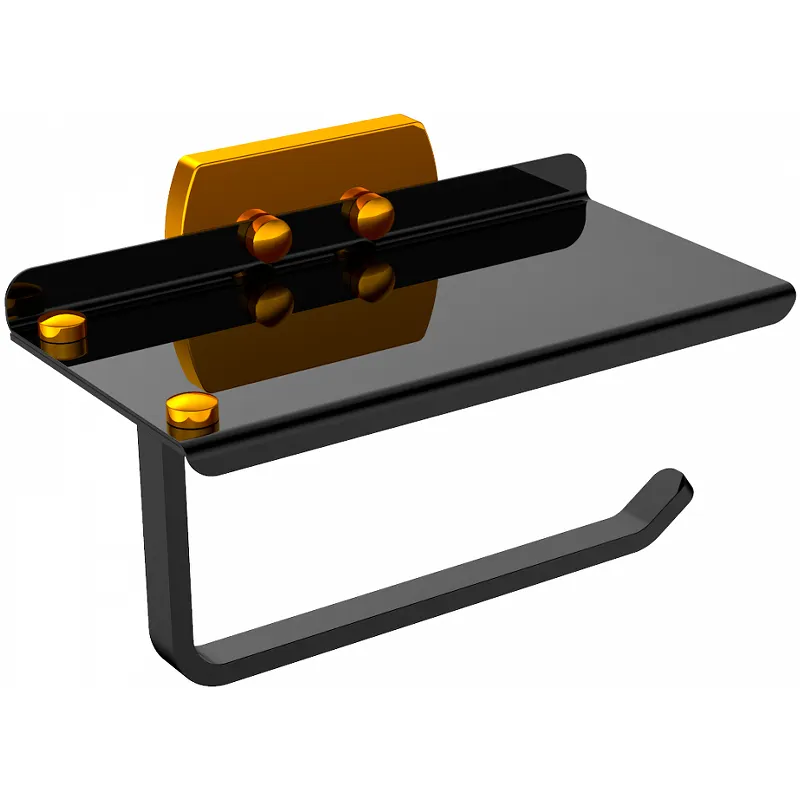 Держатель туалетной бумаги CeramaLux Azzuro 95607D с полкой.Характеристики: Цвет: черный, золото. Материал: латунь. Размеры (ШхВхД): 180х109х106 мм. Монтаж: на стену. В комплекте поставки: Держатель туалетной бумаги.