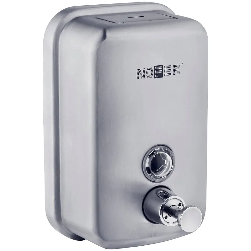 Диспенсер для жидкого мыла Nofer Inox 03001.06.S настенный выполненный в цвете матовый хром.Характеристики:Крепление: настенное.Цвет: матовая нержавеющая сталь. Управление нажимное. Корпус из нержавеющей стали AISI 1 мм. Устойчив к коррозии. Объем: 0.6 л. Рекомендуемая высота установки над столешницей: 120-200 мм. Размеры: 15 х 9.8 х 10.1 см. Подходит для всех типов мыла (кроме хирургического).В комплекте поставки: диспенсер, ключ, комплект креплений.