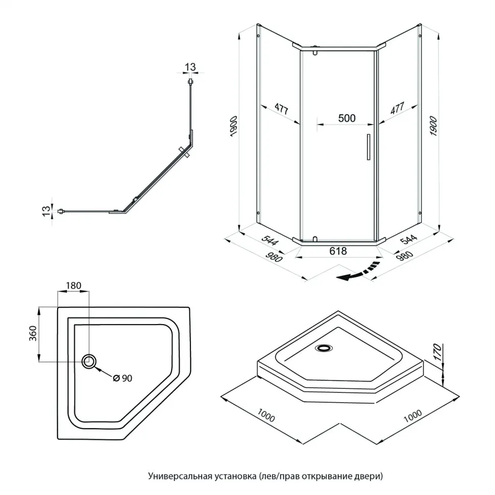 ДО "Дека-Хром", 100х100, пятиуг., низ. подд. (3 места+сифонD90мм) арт-Щ0000056816
