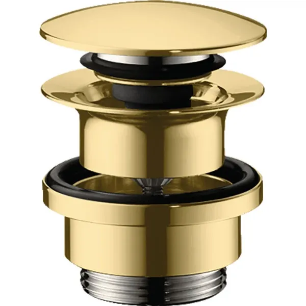 Цвет: золотой. Стандарт подключения: 1 1/4 дюйма. Управление путем нажима на пробку (push-open). Для раковин с переливом или биде. Материал сливной пробки латунь. В комплекте: донный клапан.