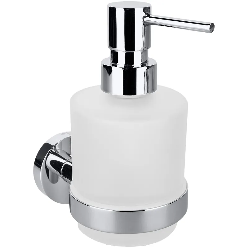 Дозатор для жидкого мыла Bemeta Omega 104109102.Характеристики: Цвет: хром. Материал: латунь, стекло матовое. Размеры (ШхВхД): 70х145х100 мм. Объем: 200 мл. Монтаж: настенный. В комплекте поставки: Дозатор для жидкого.
