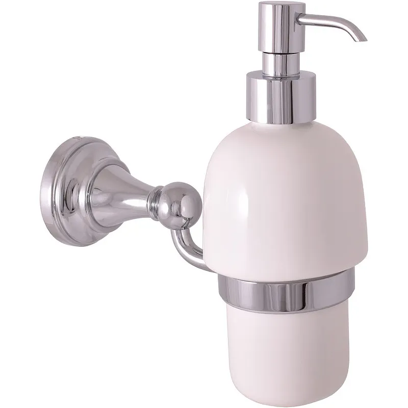Дозатор для жидкого мыла Rav Slezak Morava MKA0303.Характеристики: Цвет: хром. Материал: латунь, фаянс. Поверхность: глянцевая. Форма розетки: круглая. Объем: 300 мл. Дозировкака: 2 мл. Монтаж: настенный. Размер (ШхВхГ): 71,5х150,5х180,75 мм. В комплекте поставки: Дозатор для жидкого мыла. Настенный держатель.