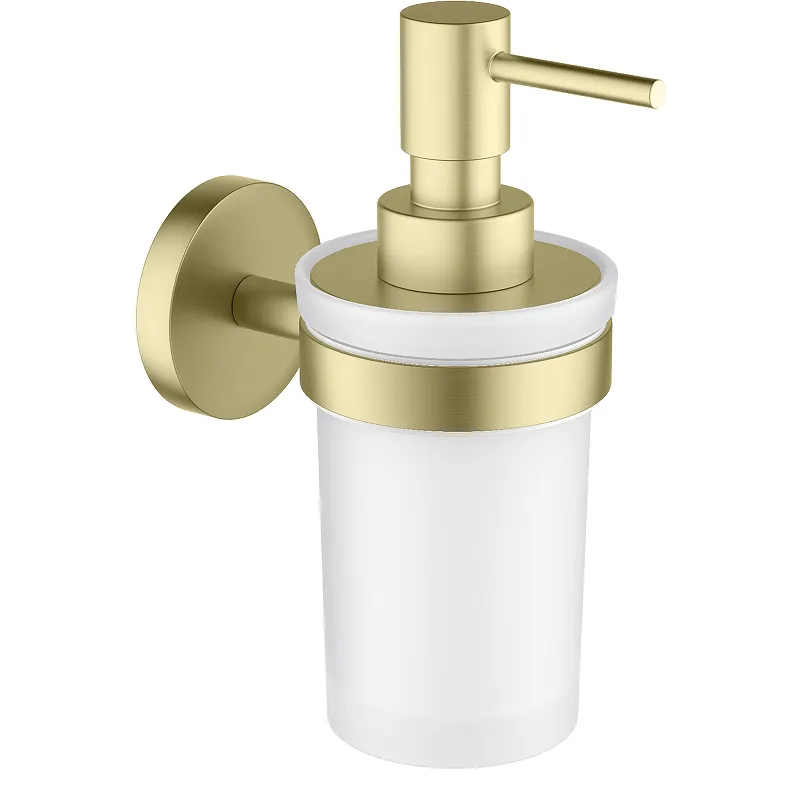 Дозатор для жидкого мыла Schein Kahlo 9138BG.Характеристики: Цвет: золото матовое. Материал: сплав металлов, стекло. Размеры (ШхВхД): 69х163х111 мм. Метод крепления: шурупы. Монтаж: настенный. В комплекте поставки: Дозатор для жидкого мыла. Держатель.