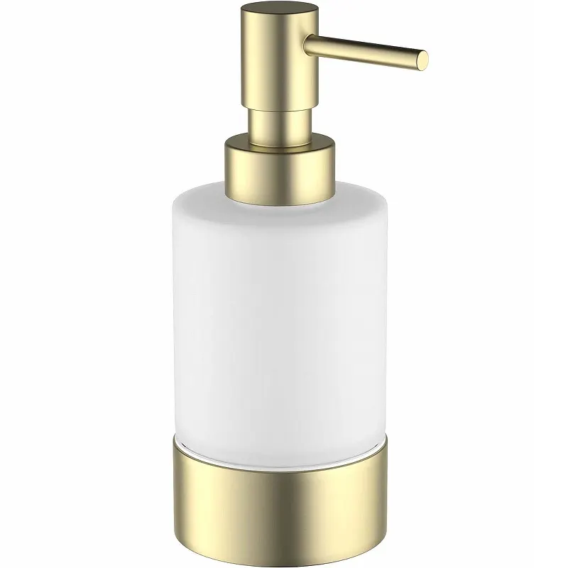 Дозатор для жидкого мыла Timo Saona 13239/17.Характеристики: Цвет: золото матовое. Материал: латунь, стекло, пластик. Поверхность: матовая. Габариты (ШхВхД): 68x158x86 мм. Монтаж: настольный. В комплекте поставки: Дозатор стеклянный. Держатель дозатора. Инструкция.