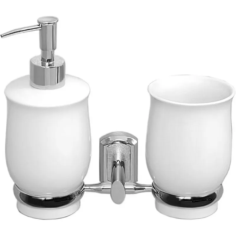 Дозатор для жидкого мыла WasserKRAFT K-24189 со стаканом для зубных щеток.Характеристики: Цвет: хром, белый. Материал: металл, фарфор. Уплотнительные пластиковые кольца. Покрытие: хромоникелевое. Монтаж: настенный. В комплекте поставки: Стакан. Дозатор для жидкого мыла. Держатель двойной.