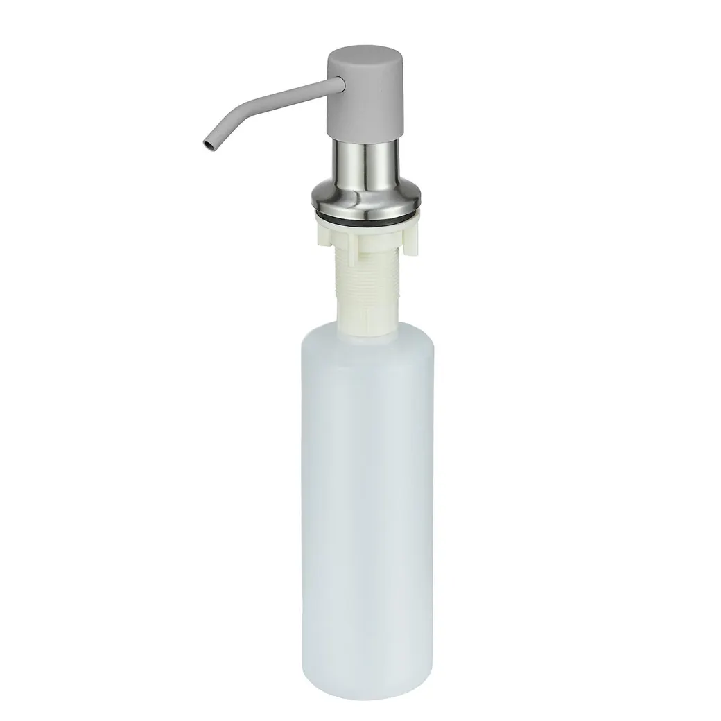 Дозатор для моющих средств Point PN3201AL серого цвета, полностью совпадает с цветом кухонных моек и смесителей Point, окрашивание дозаторова производится на собственном производстве. Дозатор предназначен для установки в заранее подготовленное отверстие диаметром 25-35 мм, его можно установить как на мойку, так и на столешницу. Максимальная толщина столешницы, в месте установки дозатора, не должна быть больше 20 мм. Наполнение колбы дозатора моющим средством производится сверху, помпа дозатора вытаскивается и через горловину колбы заливается моющее средство.
