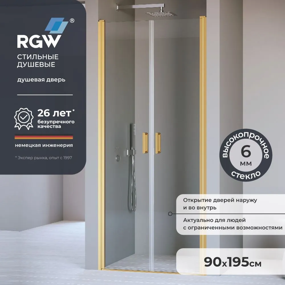 Эта душевая дверь от RGW представляет собой элегантное и надежное решение для современных ванных комнат. Душевая дверь 90*195 с распашной конструкцией и маятниковыми петлями идеально впишется в нишу, обеспечивая удобство и комфорт благодаря анодированному алюминиевому профилю в цвете золото браш и прозрачному закаленному стеклу с покрытием Easy Clean.