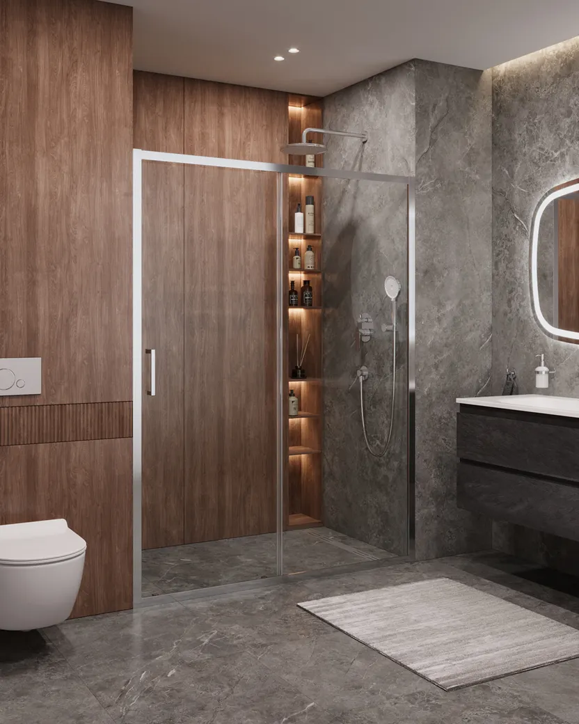 - Универсальная ориентация: Позволяет устанавливать дверь в любом направлении, обеспечивая гибкость при планировке ванной комнаты.