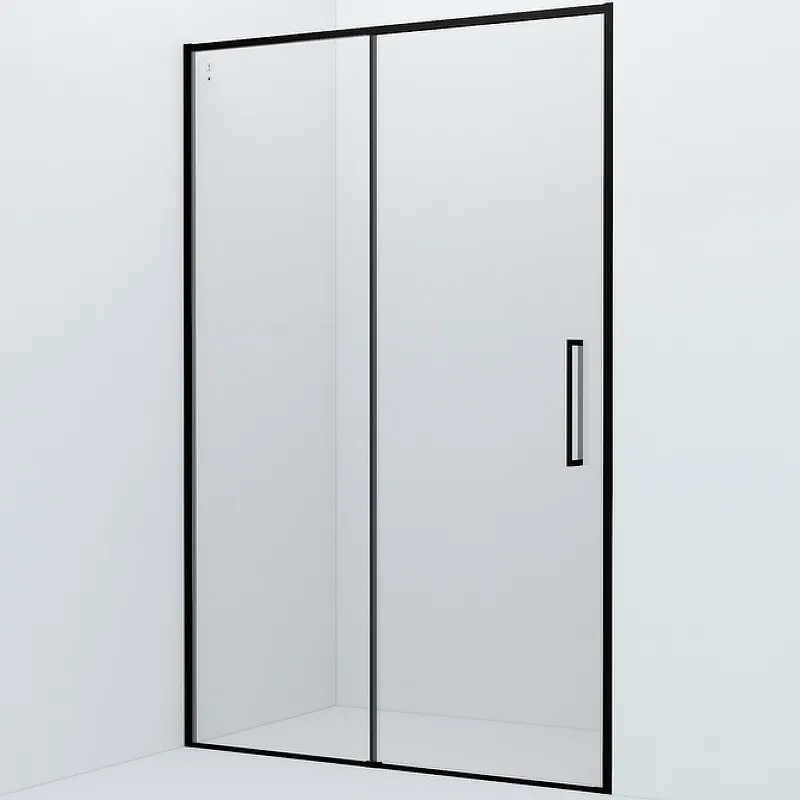Эта душевая дверь — функциональное решение для тех, кто ценит стиль и надежность. Раздвижные двери в душевую с прозрачным стеклом и черным профилем добавят элегантности вашей ванной комнате.