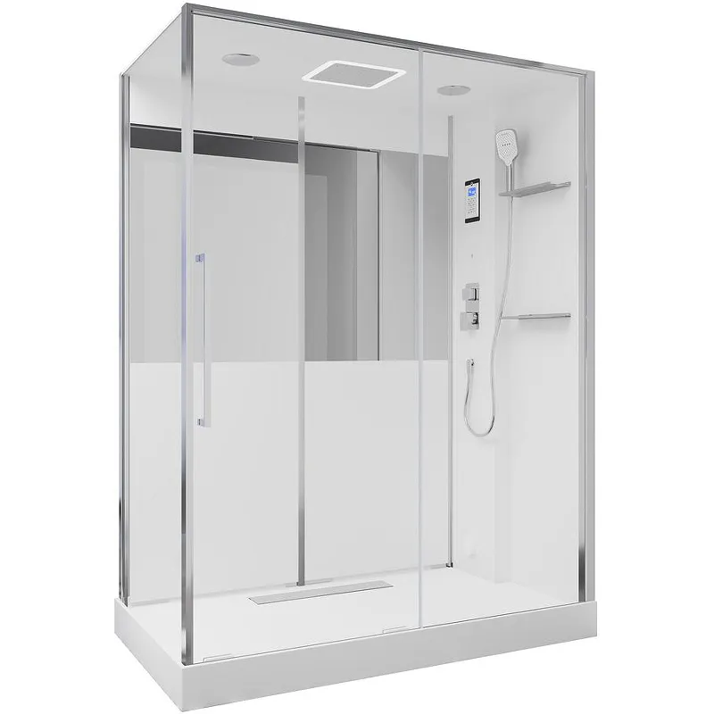 Душевая кабина Black&White Galaxy G8890 160х85 889000 с паром.Характеристики: Цвет профиля: хром. Материал профиля: алюминий. Материал панелей: закаленное стекло. Материал двери: закаленное стекло, 6 мм. Конструкция двери: раздвижная. Материал боковых стенок: закаленное стекло, 5 мм. Материал задних стенок и крыши: закаленное стекло Super White, 5 мм. Электронная панель управления: Bluetooth, FM-радио, вентиляция, озонация, тревожная кнопка. Верхняя подсветка: Led, белый цвет. Зеркало интегрировано в стекло. 2 полки для душевых принадлежностей. Размер верхнего душа: 325х290 мм. Ручной душ с 3 режимами. Душевой шланг с защитой от перекручивания. Металлические ролики внизу стекла двери. Материал поддона: акрил. Высота поддона: 150 мм. Быстрая сборка без силикона. Мощность парогенератора: 3 кВт. Реверсивная модель. Размер (ШхВхД): 1600x2180x850 мм. Монтаж: пристенный в угол. В комплекте поставки: Душевая кабина.