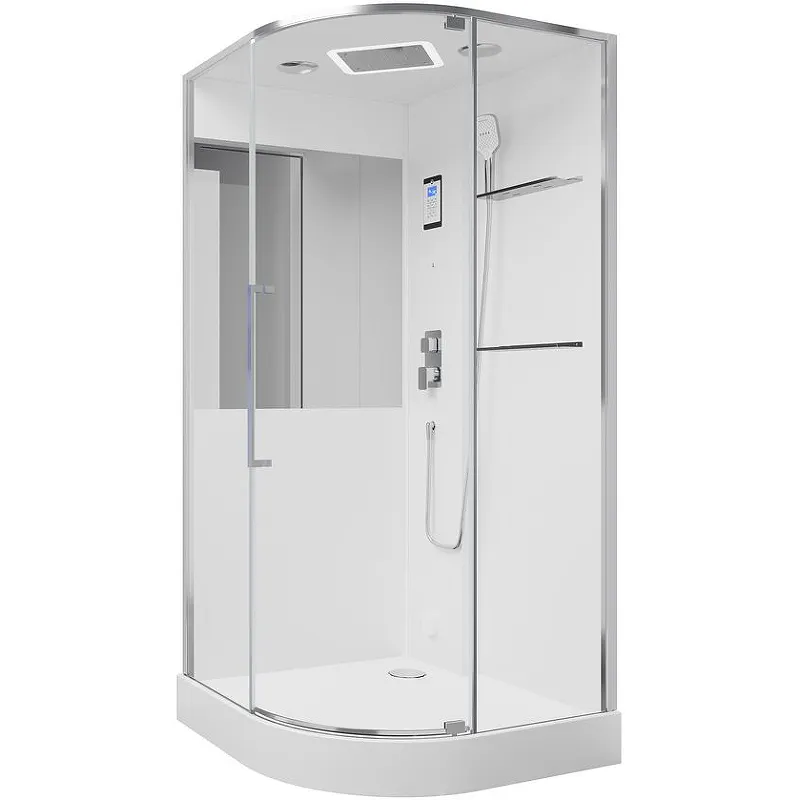 Душевая кабина Black&White Galaxy G8891 100х100 889100 с паром.Характеристики: Цвет профиля: хром. Материал профиля: алюминий. Материал панелей: закаленное стекло. Материал двери: закаленное стекло, 6 мм. Конструкция двери: раздвижная. Материал боковых стенок: закаленное стекло, 5 мм. Материал задних стенок и крыши: закаленное стекло Super White, 5 мм. Электронная панель управления: Bluetooth, FM-радио, вентиляция, озонация, тревожная кнопка. Верхняя подсветка: Led, белый цвет. Зеркало интегрировано в стекло. 2 полки для душевых принадлежностей. Размер верхнего душа: 325х290 мм. Ручной душ с 3 режимами. Душевой шланг с защитой от перекручивания. Металлические ролики внизу стекла двери. Материал поддона: акрил. Высота поддона: 150 мм. Быстрая сборка без силикона. Мощность парогенератора: 3 кВт. Реверсивная модель. Размер (ШхВхД): 995x2200x995 мм. Монтаж: пристенный в угол. В комплекте поставки: Душевая кабина.
