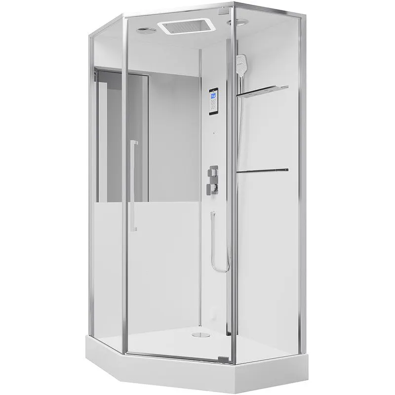 Душевая кабина Black&White Galaxy G8895 100х100 889500 с паром.Характеристики: Цвет профиля: хром. Материал профиля: алюминий. Материал панелей: закаленное стекло. Материал двери: закаленное стекло, 6 мм. Конструкция двери: раздвижная. Материал боковых стенок: закаленное стекло, 5 мм. Материал задних стенок и крыши: закаленное стекло Super White, 5 мм. Электронная панель управления: Bluetooth, FM-радио, вентиляция, озонация, тревожная кнопка. Верхняя подсветка: Led, белый цвет. Зеркало интегрировано в стекло. 2 полки для душевых принадлежностей. Размер верхнего душа: 325х290 мм. Ручной душ с 3 режимами. Душевой шланг с защитой от перекручивания. Металлические ролики внизу стекла двери. Материал поддона: акрил. Высота поддона: 150 мм. Быстрая сборка без силикона. Мощность парогенератора: 3 кВт. Реверсивная модель. Размер (ШхВхД): 995x2200x995 мм. Монтаж: пристенный в угол. В комплекте поставки: Душевая кабина.