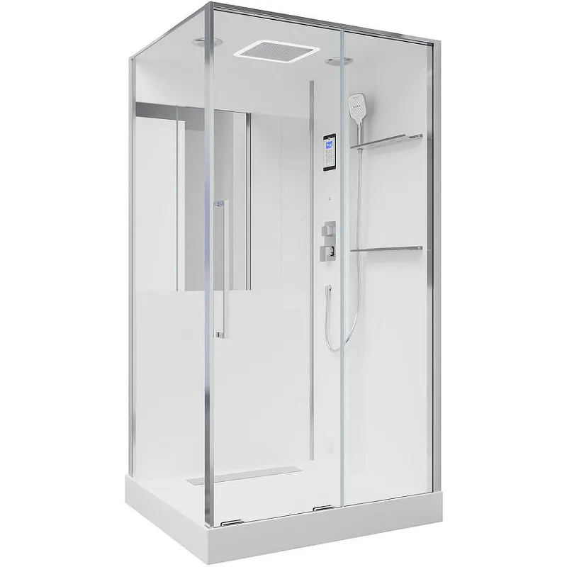 Душевая кабина Black&White Galaxy G8898 115х90 889800 с паром.Характеристики: Цвет профиля: хром. Материал профиля: алюминий. Материал панелей: закаленное стекло. Материал двери: закаленное стекло, 6 мм. Конструкция двери: раздвижная. Материал боковых стенок: закаленное стекло, 5 мм. Материал задних стенок и крыши: закаленное стекло Super White, 5 мм. Электронная панель управления: Bluetooth, FM-радио, вентиляция, озонация, тревожная кнопка. Верхняя подсветка: Led, белый цвет. Зеркало интегрировано в стекло. 2 полки для душевых принадлежностей. Размер верхнего душа: 325х290 мм. Ручной душ с 3 режимами. Душевой шланг с защитой от перекручивания. Металлические ролики внизу стекла двери. Материал поддона: акрил. Высота поддона: 150 мм. Быстрая сборка без силикона. Мощность парогенератора: 3 кВт. Реверсивная модель. Размер (ШхВхД): 1150x2180x900 мм. Монтаж: пристенный в угол. В комплекте поставки: Душевая кабина.