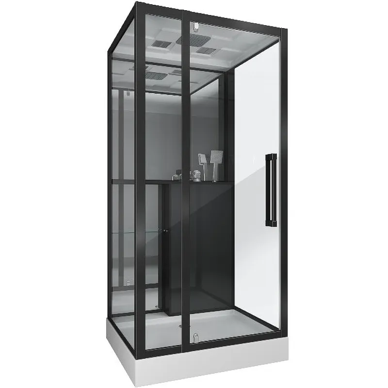 Душевая кабина Grossman 100х90 GR266.Характеристики: Форма: прямоугольная. Габариты (ШхДхВ): 1000х900х2150 мм. Ориентация: универсальная. Полотно двери изготовлено из безопасного закаленного прозрачного стекла толщиной 6 мм. Конструкция двери: распашная. Количество дверей: 1. Ширина входного проема: 530 мм. Цвет задней стенки: черный. Материал задней стенки: закаленное, крашенное стекло. Цвет корпуса: черный. Материал профиля: алюминий. Цвет профиля: черный. Материал поддона: акрил, антискользящие покрытие. Усиленный низкий поддон 150 мм. Зеркало. Крыша. Полочка. Регулируемая высота ножек: 5-15 мм Тропический (верхний) душ. В комплекте поставки: душевая кабина.