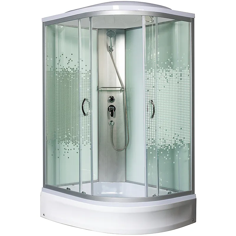 Душевая кабина Мономах 100x80x24 МЗ L 10000005821.Характеристики: Форма: асимметричная. Габариты (ШхДхВ): 1000х800х2100 мм. Ориентация: левая. Управление: ручное. Исполнение полотна двери: прозрачное стекло с рисунком мозаика, толщиной 4 мм. Конструкция двери: раздвижная. Количество дверей: 2. Цвет задней стенки: белый. Материал задней стенки: крашенное стекло. Цвет корпуса: белый. Материал профиля: алюминий. Цвет профиля: хром матовый. Материал поддона: акрил, антискользящие покрытие. Тип поддона: средний. Высота поддона: 240 мм. Регулируемая высота ножек. Смеситель: стационарный. Сифон: с гидрозатвором. Полочка. Тропический (верхний) душ. Вентиляция. В комплекте поставки: душевая кабина.