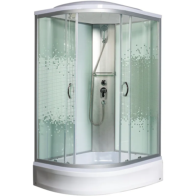 Душевая кабина Мономах 110x80x24 МЗ R 10000005824.Характеристики: Форма: асимметричная. Габариты (ШхДхВ): 1100х800х2100 мм. Ориентация: правая. Управление: ручное. Исполнение полотна двери: прозрачное стекло с рисунком мозаика, толщиной 4 мм. Конструкция двери: раздвижная. Количество дверей: 2. Цвет задней стенки: белый. Материал задней стенки: крашенное стекло. Цвет корпуса: белый. Материал профиля: алюминий. Цвет профиля: хром матовый. Материал поддона: акрил, антискользящие покрытие. Тип поддона: средний. Высота поддона: 240 мм. Регулируемая высота ножек. Смеситель: стационарный. Сифон: с гидрозатвором. Полочка. Тропический (верхний) душ. Вентиляция. В комплекте поставки: душевая кабина.