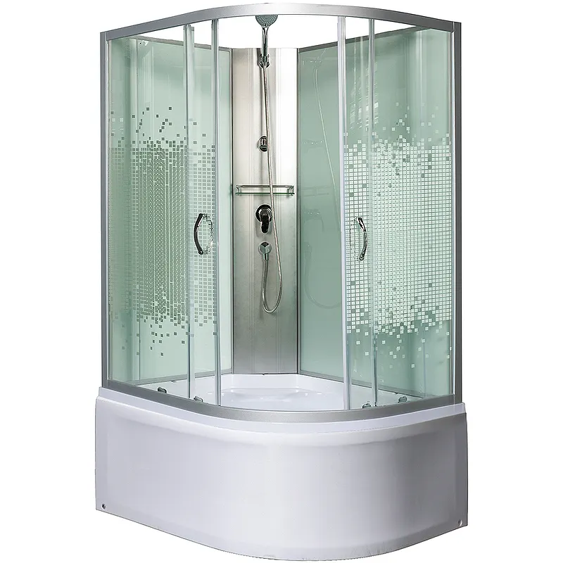 Душевая кабина Мономах Б/К 100x80x44 МЗ L 10000005829.Характеристики: Форма: асимметричная. Габариты (ШхДхВ): 1000х800х2060 мм. Ориентация: левая. Управление: ручное. Исполнение полотна двери: прозрачное стекло с рисунком мозаика, толщиной 4 мм. Конструкция двери: раздвижная. Количество дверей: 2. Цвет задней стенки: белый. Материал задней стенки: крашенное стекло. Цвет корпуса: белый. Материал профиля: алюминий. Цвет профиля: хром матовый. Материал поддона: акрил, антискользящие покрытие. Тип поддона: высокий. Высота поддона: 440 мм. Регулируемая высота ножек. Смеситель: стационарный. Сифон: с гидрозатвором. Полочка. Лейка ручного душа.Два держателя для лейки: высокий и низкий (взрослый, детский). Сиденье. В комплекте поставки: душевая кабина.