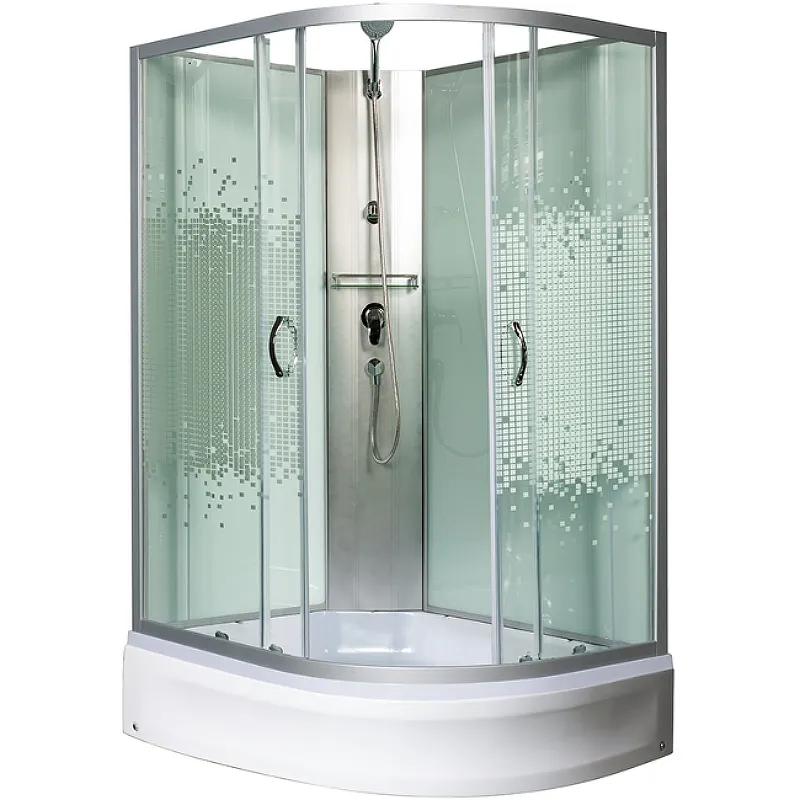 Душевая кабина Мономах Б/К 90x70x24 МЗ L 10000005803.Характеристики: Форма: асимметричная. Габариты (ШхДхВ): 900х700х2060 мм. Ориентация: левая. Управление: ручное. Исполнение полотна двери: прозрачное стекло с рисунком мозаика, толщиной 4 мм. Конструкция двери: раздвижная. Количество дверей: 2. Цвет задней стенки: белый. Материал задней стенки: крашенное стекло. Цвет корпуса: белый. Материал профиля: алюминий. Цвет профиля: хром матовый. Материал поддона: акрил, антискользящие покрытие. Тип поддона: средний. Высота поддона: 240 мм. Регулируемая высота ножек. Смеситель: стационарный. Сифон: с гидрозатвором. Полочка. Лейка ручного душа.Два держателя для лейки: высокий и низкий (взрослый, детский). В комплекте поставки: душевая кабина.