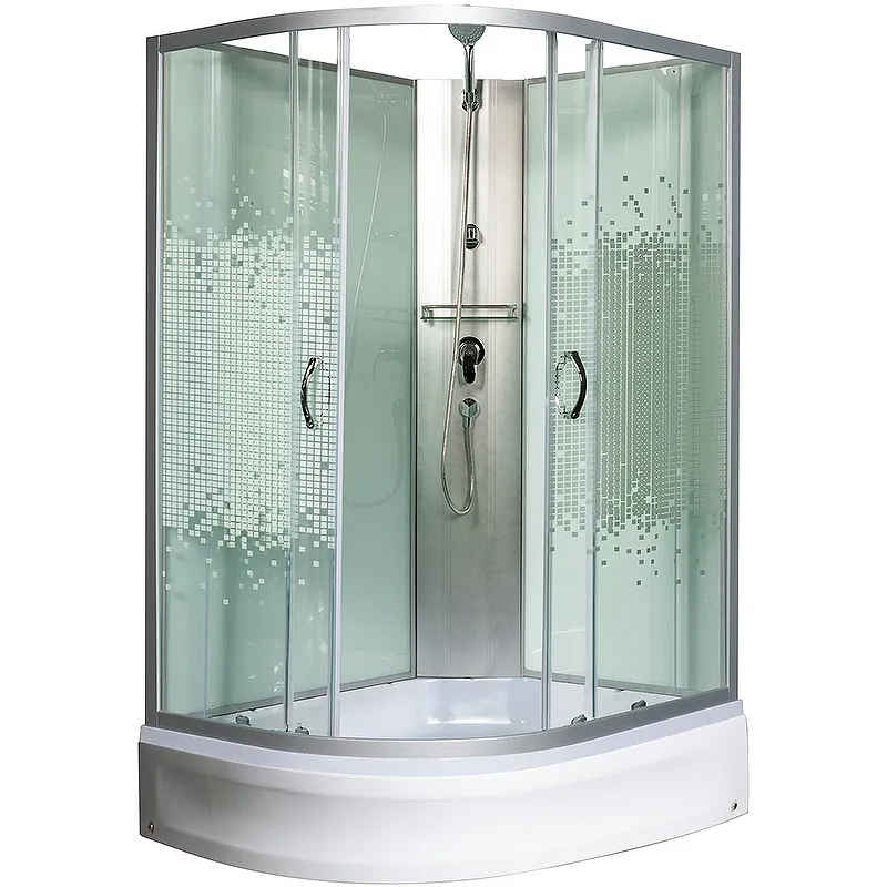 Душевая кабина Мономах Б/К 90x80x24 МЗ R 10000005806.Характеристики: Форма: асимметричная. Габариты (ШхДхВ): 900х800х2060 мм. Ориентация: правая. Управление: ручное. Исполнение полотна двери: прозрачное стекло с рисунком мозаика, толщиной 4 мм. Конструкция двери: раздвижная. Количество дверей: 2. Цвет задней стенки: белый. Материал задней стенки: крашенное стекло. Цвет корпуса: белый. Материал профиля: алюминий. Цвет профиля: хром матовый. Материал поддона: акрил, антискользящие покрытие. Тип поддона: средний. Высота поддона: 240 мм. Регулируемая высота ножек. Смеситель: стационарный. Сифон: с гидрозатвором. Полочка. Лейка ручного душа.Два держателя для лейки: высокий и низкий (взрослый, детский). В комплекте поставки: душевая кабина.