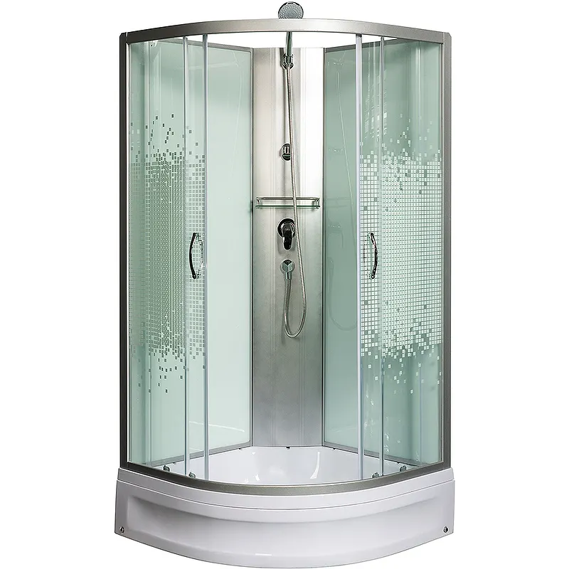 Душевая кабина Мономах Б/К 90x90x24 С МЗ 10000005771.Характеристики: Форма: четверть круга. Габариты (ШхДхВ): 900х900х2060 мм. Ориентация: универсальная. Управление: ручное. Исполнение полотна двери: прозрачное стекло с рисунком мозаика, толщиной 4 мм. Конструкция двери: раздвижная. Количество дверей: 2. Цвет задней стенки: белый. Материал задней стенки: крашенное стекло. Цвет корпуса: белый. Материал профиля: алюминий. Цвет профиля: хром матовый. Материал поддона: акрил, антискользящие покрытие. Тип поддона: средний. Высота поддона: 240 мм. Регулируемая высота ножек. Смеситель: стационарный. Сифон: с гидрозатвором. Полочка. Лейка ручного душа.Два держателя для лейки: высокий и низкий (взрослый, детский). В комплекте поставки: душевая кабина.
