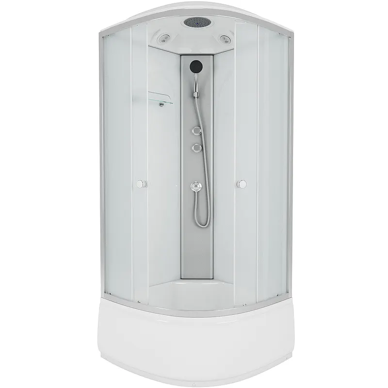 Душевая кабина Niagara Eco 90x90 E90/40/MT.Характеристики: Цвет профиля: серебро. Материал профиля: алюминий. Полотно двери: матовое стекло толщиной 4 мм. Задняя стенка: стекло белого цвета. Форма: четверть круга. Конструкция дверей: раздвижная. Количество секций двери: 2. Ширина входа: 440 мм. Размеры (ШхВхД): 900х2150х900. Материал поддона: ABS-пластик. Тип поддона: высокий, 400 мм. Глубина поддона: 270 мм. Антискользящее покрытие. Регулируемая высота ножек:15 мм. Усиленное дно поддона, нагрузка до 350 кг. Верхний душ. Полочка. Ручной душ. Ориентация: универсальная. Бессиликоновая сборка. Монтаж: в угол. В комплекте поставки: Душевая кабина.