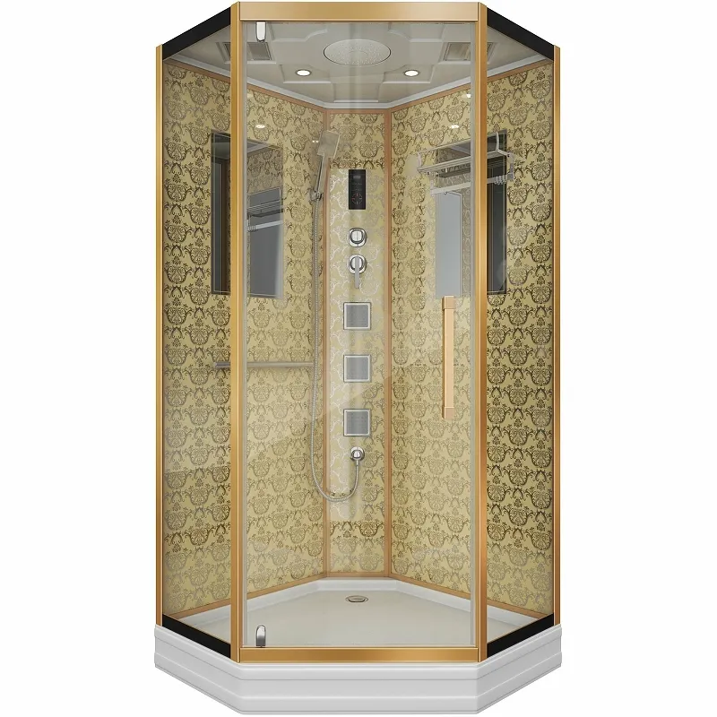 Элегантная душевая кабина Niagara Luxe NG-7717G 100x100 с гидромассажем предлагает идеальное сочетание стиля и функциональности. Эта угловая душевая кабина с низким поддоном и крышей станет отличным выбором для современных ванных комнат. Высокие стенки и изящный золотой профиль из алюминия подчеркивают изысканный дизайн, при этом обеспечивая удобство и комфорт.