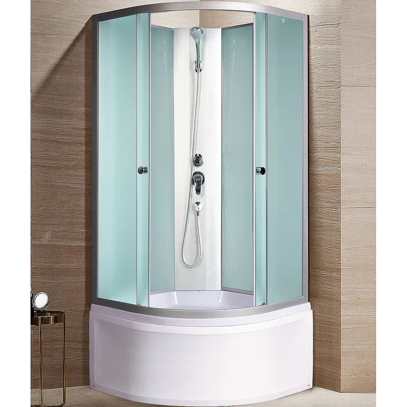 Душевая кабина River Nara Light 90х90x44 МТ Б/К 10000003576.Кабина оснащена полочкой и ручным душем. Современная форма модели прекрасно впишется в ванную комнату любой стилистической направленности.Характеристики: Цвет профиля: хром матовый. Материал профиль: алюминиевый. Форма: четверть круга. Размер (ШxВxД): 90x206x90 см. Цвет задней стенки: прозрачный. Цвет двери: матовый. Количество дверей: 2. Ручной душ 3-х позиционный. Конструкция дверей: раздвижная. Тип управления: ручное. Смеситель из латуни с керамическим картриджем. Оснащение: полочка с ограничителем, душевой гарнитур. В комплекте поставки: душевая кабина (стекла, профиль, поддон), душевой набор, фурнитура, комплектующие).
