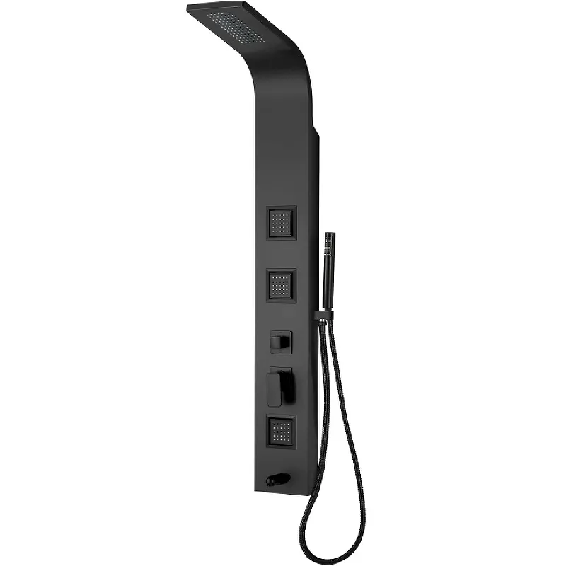 Душевая панель beWash BV1TMSP7801 с гидромассажем.Характеристики: Цвет: черный матовый. Материал: алюминий, латунь. Антиизвестковое покрытие. Управление: рычажное. Механизм: керамический картридж. Легкое очищение. Активные форсунки - 3 шт. Эффект массажа. Трехфункциональный керамический переключатель. Длина душевого шланга: 150 см. Стандарт подводки: 1/2. Монтаж: на стену. В комплекте поставки: Душевая панель.