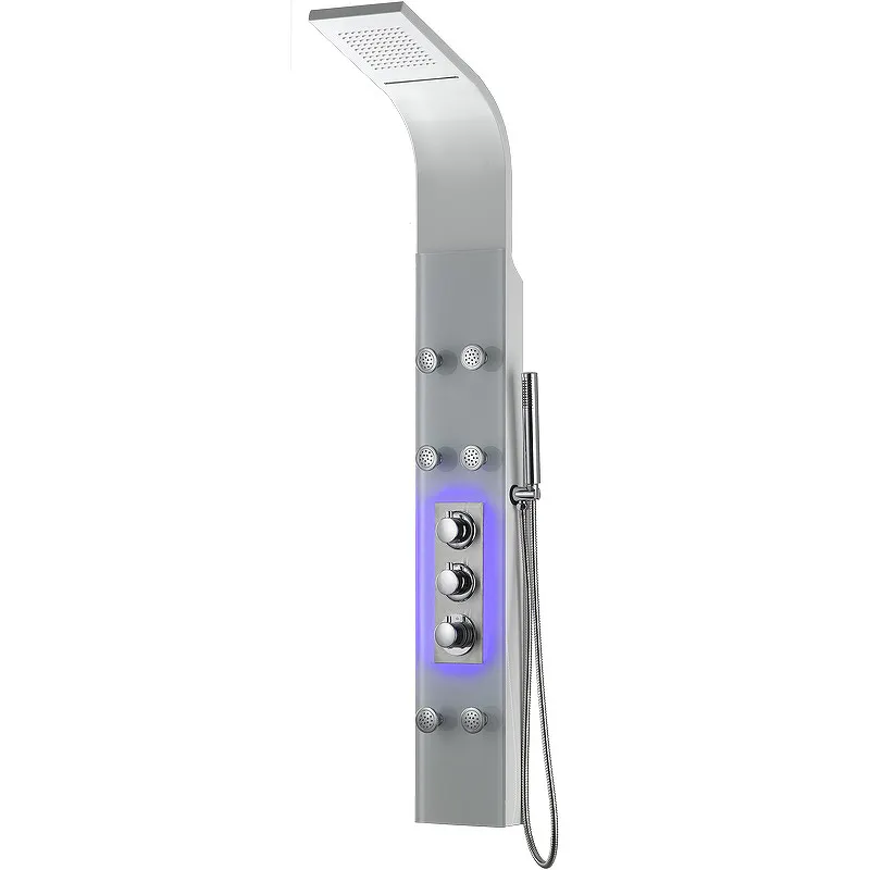 Душевая панель beWash BV3TMSP7233 с гидромассажем.Характеристики: Цвет: белый. Материал: алюминий, стекло, латунь. Антиизвестковое покрытие. Управление: термостат. Механизм: термостатический картридж. Ограничение температуры. Легкое очищение. Ограничитель температуры. Подсветка. Активные форсунки - 6 шт. Верхний душ - режим водопад. Однофункциональный ручной душ с системой антикальк. Трехфункциональный керамический переключатель. Длина душевого шланга: 150 см. Стандарт подводки: 1/2. Монтаж: на стену. В комплекте поставки: Душевая панель.