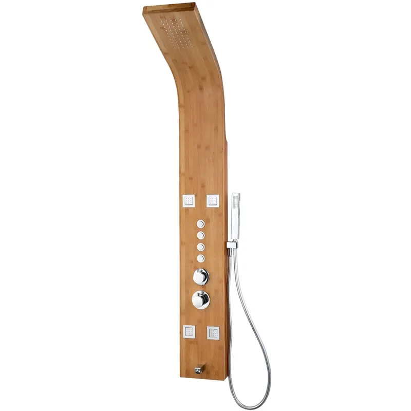 Душевая панель Denberg LT-202.Превосходно сочетается в интерьере современного стиля благодаря стильному дизайну, удобной конструкции и функциональности.Характеристики: Цвет: бамбук. Встроенные гидромассажные форсунки. Тропический верхний душ. Самоочищающиеся форсунки у верхнего душа. Смеситель термостатический встроенный. Встроенное четырех функциональное кнопочное переключение. Боковой душ выполнен из латуни. Душевой шланг гибкий Iseflex 1,5 м. Латунный излив. В комплекте поставки: душевая панель, инструкция.