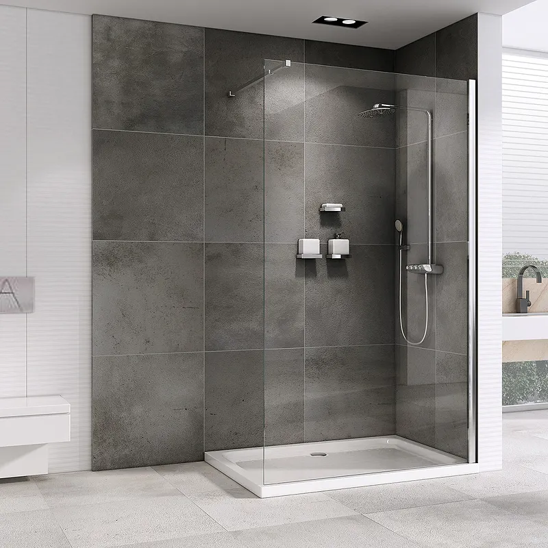 - Прозрачное стекло для душевых перегородок: обеспечивает максимум света и визуально расширяет пространство.