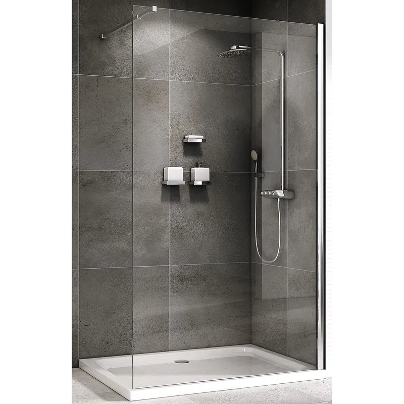 Душевая перегородка Abber Immer Offen 90 AG61090.Характеристики: Цвет профиля: хром. Витраж: прозрачное стекло толщиной 6 мм. Габариты (ШхВ): 90х200 см. Ориентация: универсальная. Монтаж: на поддон/на пол. В комплекте поставки: душевая перегородка, кронштейн.
