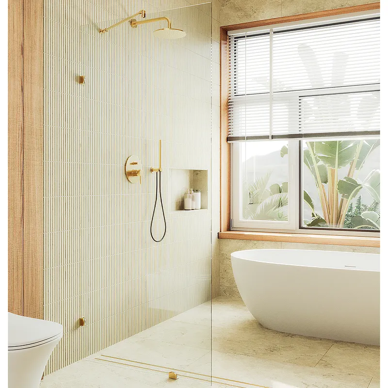 Душевая перегородка Maybah Glass MGD-260-3 890x1950 коннектор стена-стекло.Характеристики: Цвет профиля: золото. Материал профиля: анодированный алюминий. Вид профиля: коннектор стена-стекло. Исполнение полотна перегородки: прозрачное закаленное стекло, толщиной 8 мм. Размеры (ШхВ): 890х1950 мм. Конструкция перегородки: неподвижная. Ориентация: универсальная. Установка: на поддон, на пол. Монтаж: пристенный. В комплекте поставки: Закаленное стекло, цвет Бесцветный, толщина 8 мм 1950х890 мм - 1 шт. Коннектор стена-стекло, цвет Золото - 3 шт. Штанга стена-стекло - 1 шт. Комплект крепежа - 1 шт. Уплотнитель - 2 шт. Инструкция по монтажу - 1 шт.
