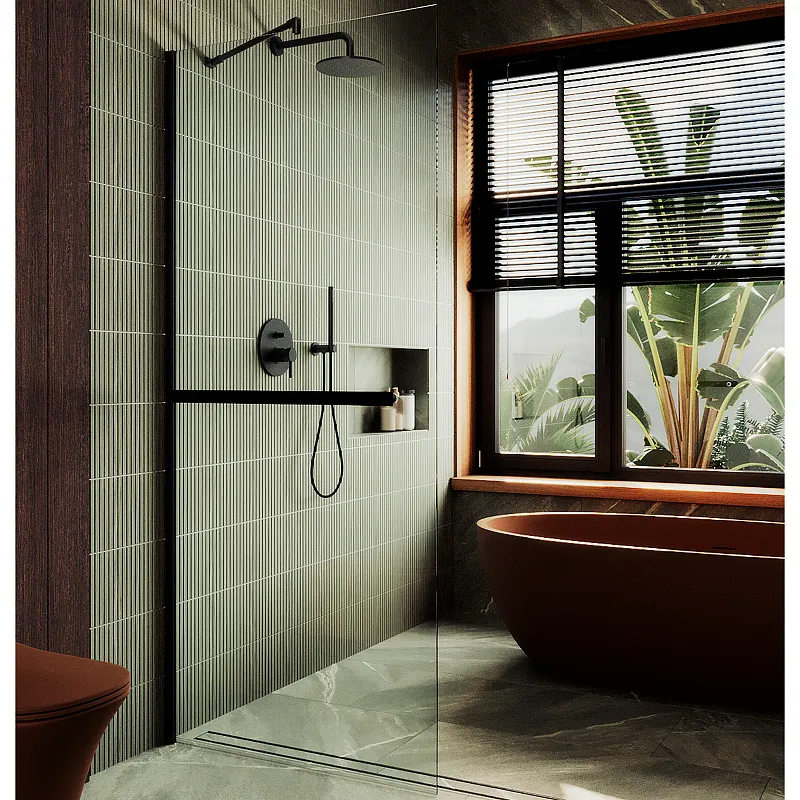 Душевая перегородка Maybah Glass MGD-708-6ш 1090x1950 в широком профиле.Характеристики: Цвет профиля: черный. Материал профиля: анодированный алюминий. Вид профиля: широкий. Исполнение полотна перегородки: прозрачное закаленное стекло, толщиной 8 мм. Размеры (ШхВ): 1090х1950 мм. Конструкция перегородки: неподвижная. Ориентация: универсальная. Полотенцедержатель. Установка: на поддон, на пол. Монтаж: пристенный. В комплекте поставки: Закаленное стекло, цвет Бесцветный, толщина 8 мм 1950х1090 мм - 1 шт. Профиль П-образный, цвет Черный - 1 шт. Штанга стена-стекло - 1 шт. Полотенцедержатель - 1 шт. Комплект крепежа - 1 шт. Уплотнитель - 2 шт. Инструкция по монтажу - 1 шт.