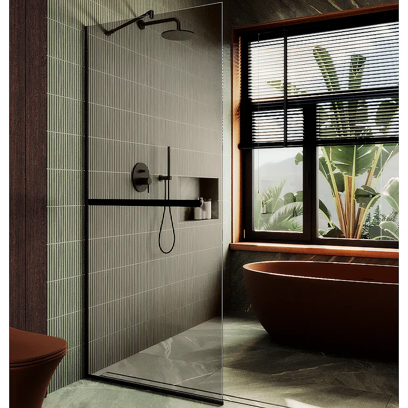 Душевая перегородка Maybah Glass MGD-733-6у 890x1950 в узком профиле.Характеристики: Цвет профиля: черный. Материал профиля: анодированный алюминий. Вид профиля: узкий. Исполнение полотна перегородки: бронзовое закаленное стекло, толщиной 8 мм. Размеры (ШхВ): 890х1950 мм. Конструкция перегородки: неподвижная. Ориентация: универсальная. Полотенцедержатель. Установка: на поддон, на пол. Монтаж: пристенный. В комплекте поставки: Закаленное стекло, цвет Бронза, толщина 8 мм 1950х890 мм - 1 шт. Профиль П-образный, цвет Черный - 2 шт. Штанга стена-стекло - 1 шт. Полотенцедержатель - 1 шт. Комплект крепежа - 1 шт. Инструкция по монтажу - 1 шт.