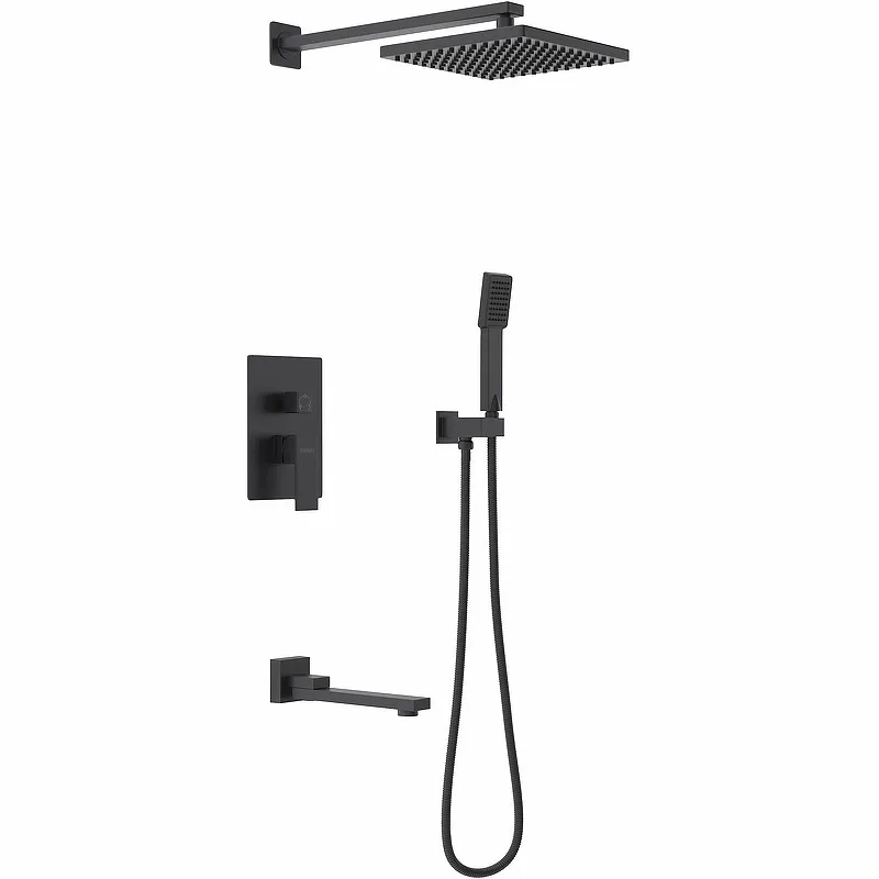 Душевая система Berges Nardis 3S 071011.Характеристики: Цвет: черный матовый. Материал смесителя: латунь. Материал ручного душа и верхнего душа: ABS-пластик. Держатель верхнего душа: нержавеющая сталь. Держатель ручного душа и излив: латунь. Душевой шланг длиной 1500 мм из нержавеющей стали (внутри epdm). Механизм: керамический картридж 28 л/мин. Управление: однорычажное. Излив: поворотный. Вылет верхнего душа: 400 мм. Размер верхнего душа (ШхД): 230х230 мм. Форма верхнего душа: квадратная. Длина ручного душа: 240 мм. Форма ручного душа: прямоугольная. Количество режимов струи ручного душа: 1. Система против известковых отложений. Экономия расхода воды. Стандарт подводки: G 1/2. Монтаж: встраиваемый. В комплекте поставки: Смеситель (внешняя и внутренняя часть). Излив. Верхний душ. Ручной душ. Шланг для ручного душа. Кронштейн верхнего душа. Держатель ручного душа.