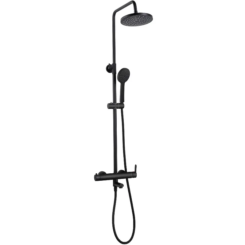 Душевая система beWash BV1MMSS6612.Характеристики: Цвет: черный матовый. Материал: латунь. Антиизвестковое покрытие. Управление: однорычажное. Механизм: керамический картридж. Легкое очищение от налета. Самоочищающееся покрытие. Антибактериальная защита. Регулировка напора. Девиатор. Система против известковых отложений. Защита шланга от перекручивания. Исполнение шланга: пластиковый. Душевая штанга регулируется по высоте: 830-1190 мм. Диаметр верхнего душа: 200 мм. Материал лейки: пластик. Стандарт подводки: 1/2. Количество монтажных отверстий: 3. Монтаж: настенный. В комплекте поставки: Смеситель. Излив. Душевая штанга. Верхний (тропический) душ. Шланг душевой. Лейка душевая. Держатель душевой лейки.