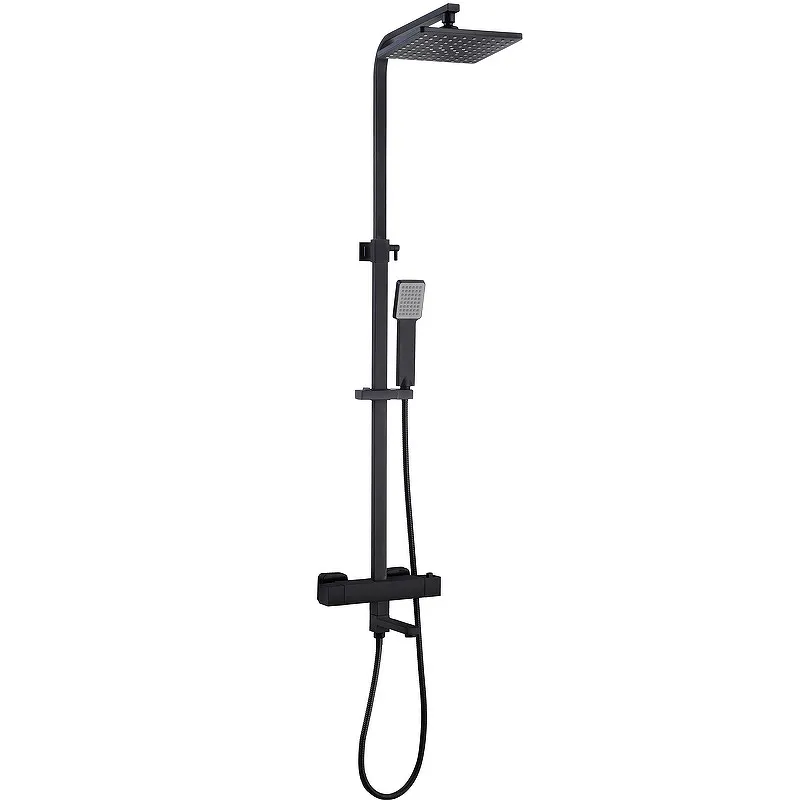 Душевая система beWash BV1TMSS6620 с термостатом.Характеристики: Цвет: черный матовый. Материал: латунь. Антиизвестковое покрытие. Управление: термостат. Механизм: термостатический картридж. Легкое очищение от налета. Антибактериальная защита. Регулировка напора. Девиатор. Система против известковых отложений. Защита шланга от перекручивания. Исполнение шланга: пластиковый. Душевая штанга регулируется по высоте: 790-1190 мм. Размер верхнего душа: 200х200 мм. Материал лейки: пластик. Стандарт подводки: 1/2. Количество монтажных отверстий: 3. Монтаж: настенный. В комплекте поставки: Смеситель. Излив. Душевая штанга. Верхний (тропический) душ. Шланг душевой. Лейка душевая. Держатель душевой лейки.