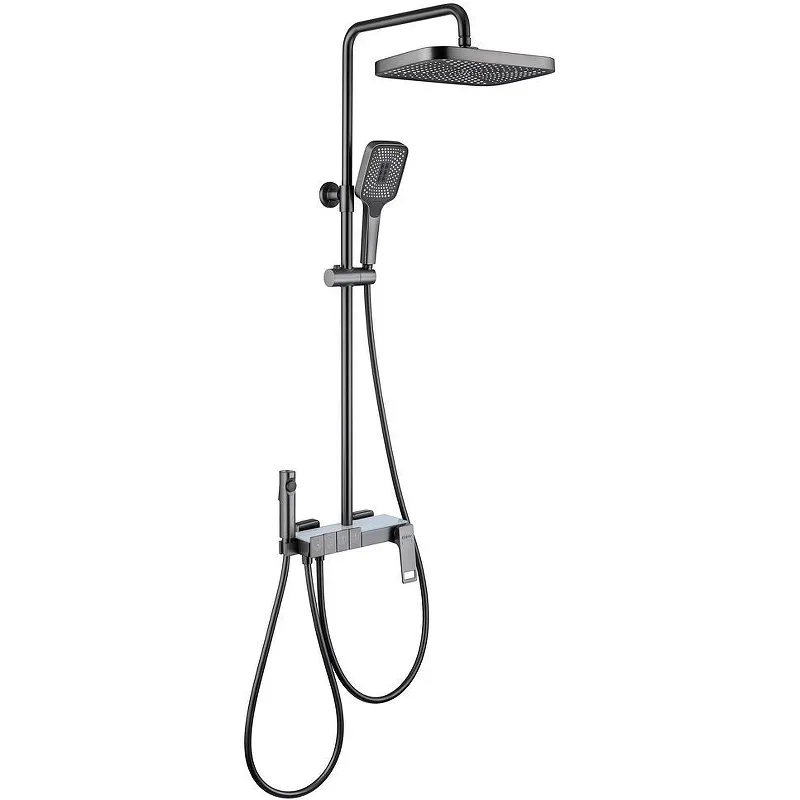 Душевая система Black&White Universe UK5012MG 5012MG.Характеристики: Цвет: Gun Metal (оружейный металл). Материал: латунь EN 59-1, белое закаленное стекло. Управление: однорычажное. Переключение функций: кнопочное. Механизм: керамический картридж. Стандарт подводки: G1/2. Излив: фиксированный. Аэратор. Регулировка напора. Материал верхнего и ручного душа: ABS-пластик. Размер верхнего душа (ШхД): 300х210 мм. Форма верхнего душа: прямоугольная. Количество режимов струи ручного душа: 2. Форма ручного душа: прямоугольная. Длина душевого шланга: 1500 мм. Монтаж: на стену. В комплекте поставки: Душевая система. Смеситель. Верхний душ. Ручной душ. Шланг для ручного душа. Душевая штанга. Кронштейн верхнего душа. Держатель ручного душа. Гигиеническая лейка.