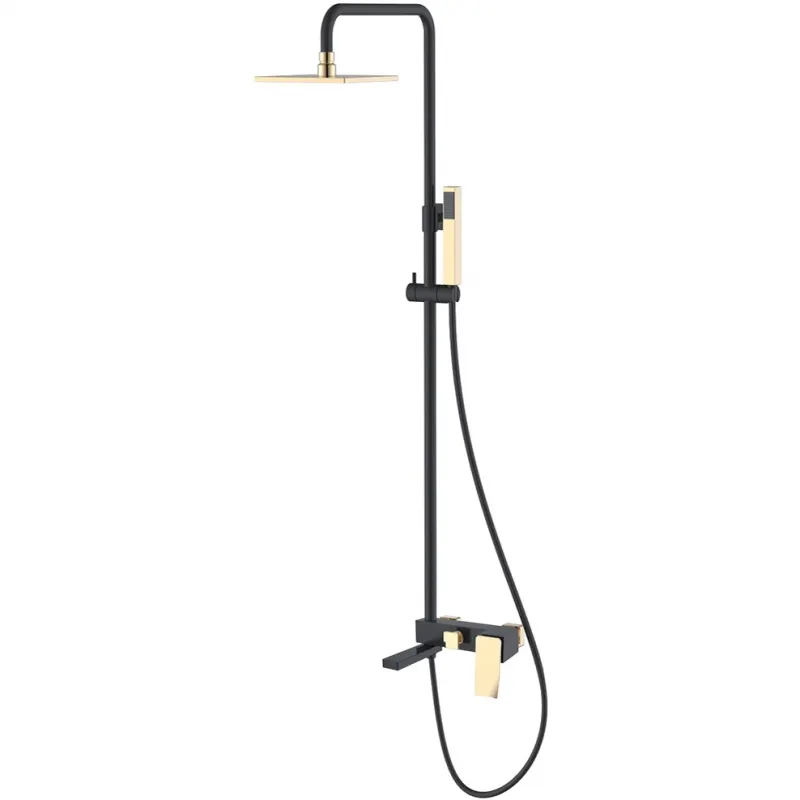 Душевая система Boheme Q 148-BG.2.Характеристики:Цвет: черный, золото.Материал: латунь.Регулируемая высота душевой стойки.Верхний душ прямоугольной формы.Ручной душ с держателем на стойке.Однорычажное переключение.Монтаж: на стену.Стандарт подключения: G 1/2.В комплекте поставкисмеситель; верхний душ; ручной душ; душевая штанга; душевой шланг; гибкая подводка G1/2; крепежный комплект.