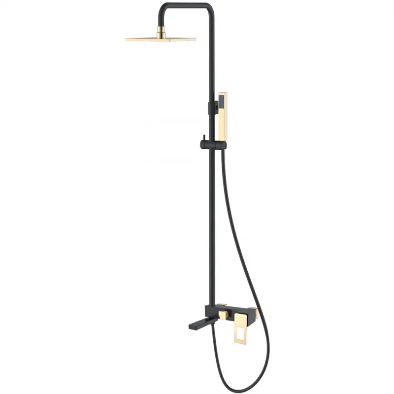 Душевая система Boheme Q 148-BG.Характеристики:Цвет: черный, золото.Материал: латунь.Регулируемая высота душевой стойки.Верхний душ прямоугольной формы.Ручной душ с держателем на стойке.Однорычажное переключение.Монтаж: на стену.Стандарт подключения: G 1/2.В комплекте поставкисмеситель; верхний душ; ручной душ; душевая штанга; душевой шланг; гибкая подводка G1/2; крепежный комплект.